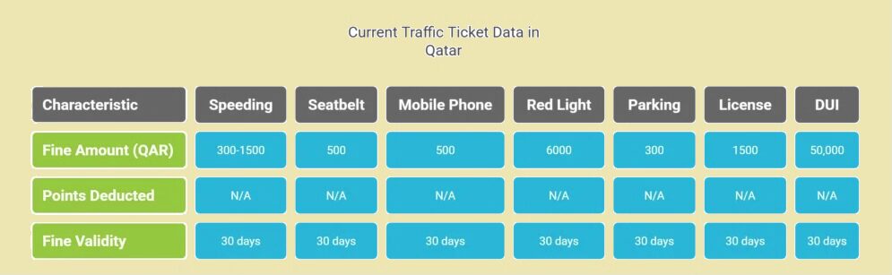 Below is a detailed table showing various traffic offenses, their fines in QAR, and any applicable penalty points: