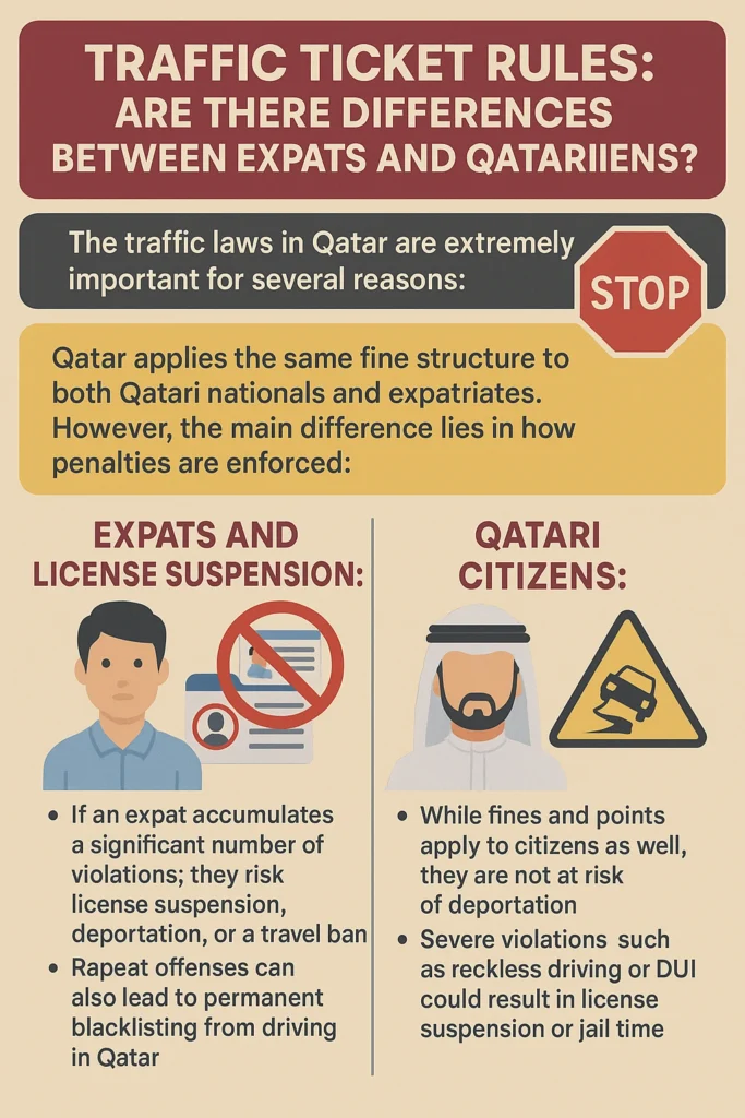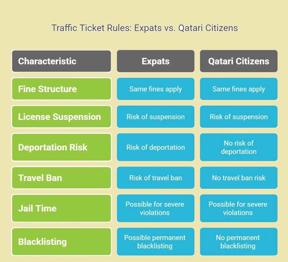 Traffic regulations in Qatar are strictly enforced and apply equally to both Qatari citizens and expatriates. While the fine system is the same for everyone, the way penalties are implemented differs depending on residency status.